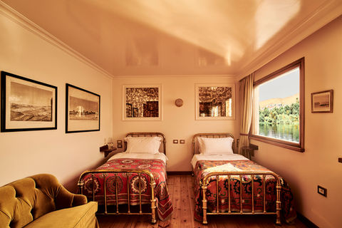 This 55-meter dahabeya (double masted Nile cruiser) Nile Canopus, reflects a contemporary take on Egypt’s Golden Era of travel in the late 1800s, when writer Amelia Edwards – one of the first female Egyptologists – spent weeks sailing up the Nile taking notes and making illustrations for her celebrated travelogue A Thousand Miles up the Nile. Everything on the boat, other than a selection of carefully selected antiques, has been custom-made in Egypt. In addition, Nile Canopus offers multiple indoor and outdoor areas and decks to relax and dine. A safari-style tent – a wink to famed archaeologist Howard Carter’s abode during his time in Egypt discovering Tutankhamun’s tomb – shades part of the upper deck, providing a unique spot to sit and watch the timeless scenes along the River Nile pass by.